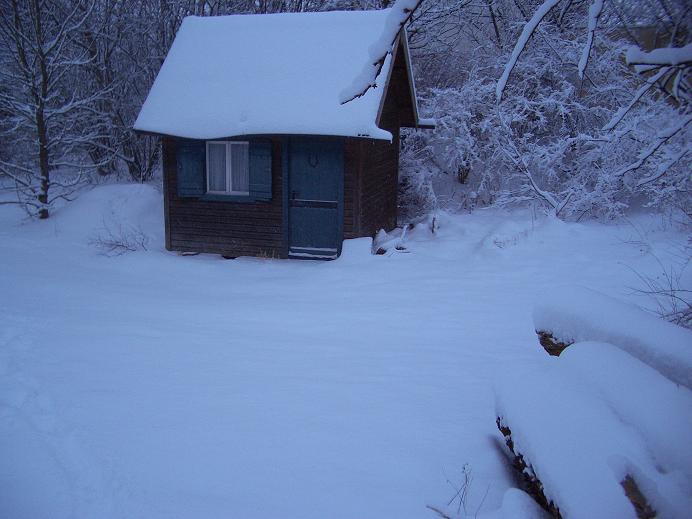 Unser Gartenhaus, vorgestern geknipst. Rechts davon soll in diesem Jahr ein Teich entstehen.