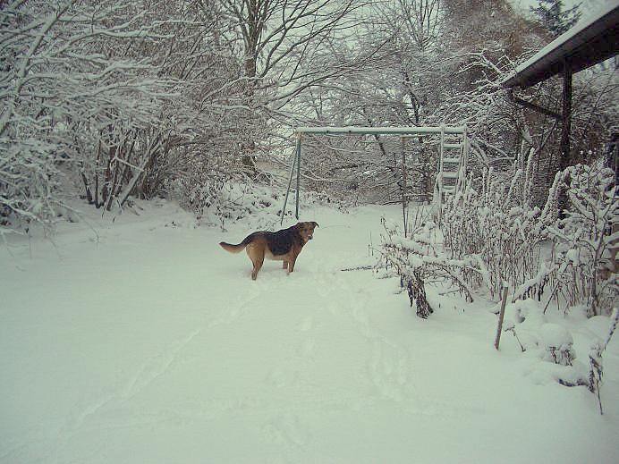 Nelly freut sich besonders über Schnee. Leider begreift sie den Zusammenhang zwischen Schnee-Fressen und Bauchwehkriegen nicht so ganz