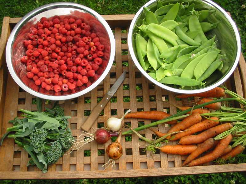 Die erste Schüssel Himbeeren (Wilde aus dem Streifen zwischen unseren zwei Maschendrahtzäunen), Zuckerschoten Schweizer Riesen und Sugar Bon, Polizeiknüppelmöhren