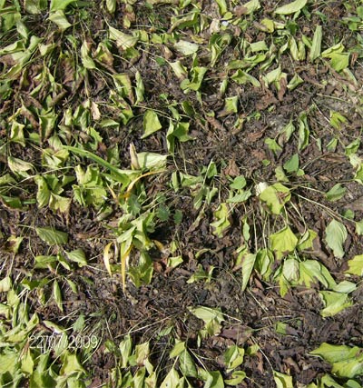 Und die Sträucher reagieren mit vorgezogenem Blattfall (siehe Bild). Da blutet einem das Herz, aber ich kann nicht 2500 m² mit der Gieskanne wässern
