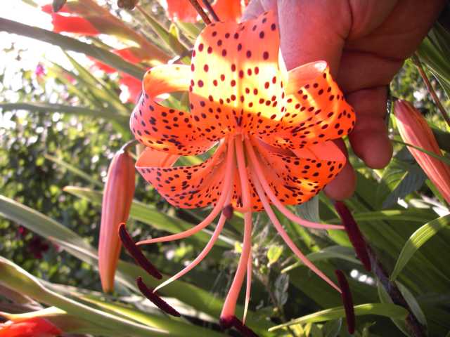 Lilium henry (ist sie es?), immer wieder überraschend, wie sie mit dem bogigen Wuchs aus den Sträuchern kommt.