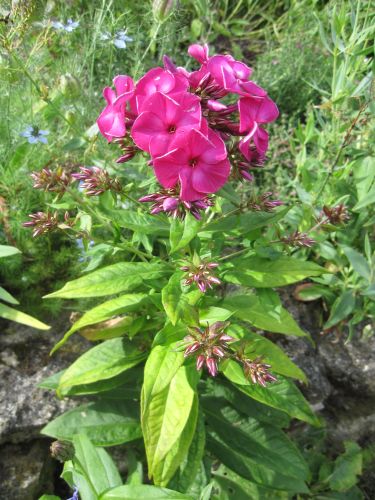Ich muss euch mal meine Begeisterung über einen eigenen Zufallsphloxsämling mitteilen. Es ist ds erste Mal, dass ich in 20 Jahren einen Phloxsämling habe und zwar an einer Stelle, wo ich nie einen Phlox hingepflanzt hätte. Wahrscheinlich ist Samen ausgefallen, als ich abgeschnittene alte Phloxstengel zum Häckseln getragen habe.Hier der Gesamthabitus, kräftig mit blühenden Achseltrieben.