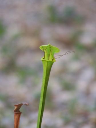 Bei mir war es heute eine der Sarracenias. Im allerkleinsten Schlauch steckte eine Schnake, die so groß war, daß die Beine noch rausschauten (ich hoffe, man kann es auf dem Foto erkennen). Es sah ungefähr so aus, wie bei den Kindern, wenn es irgendein Lieblingsessen gibt.