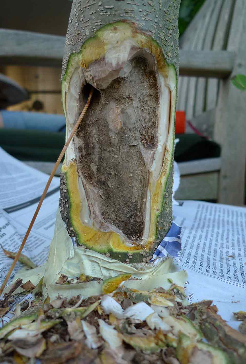 Hier ist sichtbar, dass die Höhlung (so lang wie der Stängel) einen Zentimeter höher reicht als die Aststelle, die möglicherweise mitverantwortlich ist für die Wunde unten.Kann oben Feuchtigkeit eingedrungen sein, die das Holz unten hat faulen lassen?
