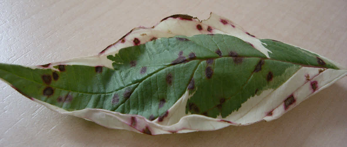 Hallo,das Schadbild ist bei panaschierten Hartriegeln nicht selten zu finden. Die Ursache dafür liegt in einer Pilzinfektion (Septoria, Elsinoe). Das Auftreten ist vom Klima abhängig (feuchtwarm) und daher von Jahr zu Jahr in unterschiedlichem Ausmass zu beobachten. Was Du dagegen machen kannst? Den Strauch mit einem Fungizid behandeln beim Anschwellen der Knospen im Frühjahr. Blätter einsammeln oder spezielle Düngergaben sind nicht zielführend, ebenso bringt ein Rückschnitt nichts.