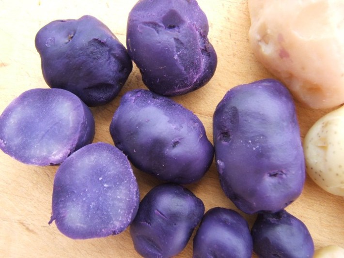 Welches Kraut?Hier ist vom Kraut nichts mehr zu sehen!Und leider sind auch einzelne Kartoffeln schon faulig.Hier ein Bild der geschälten Vitelotte (neben Rosara und unbekannt)Die Farbe ist wirklich beeindruckend, obwohl Nicola doch besser schmeckt.ZG, die Kerkauer Kipfler scheinen ja wirklich toll zu sein!