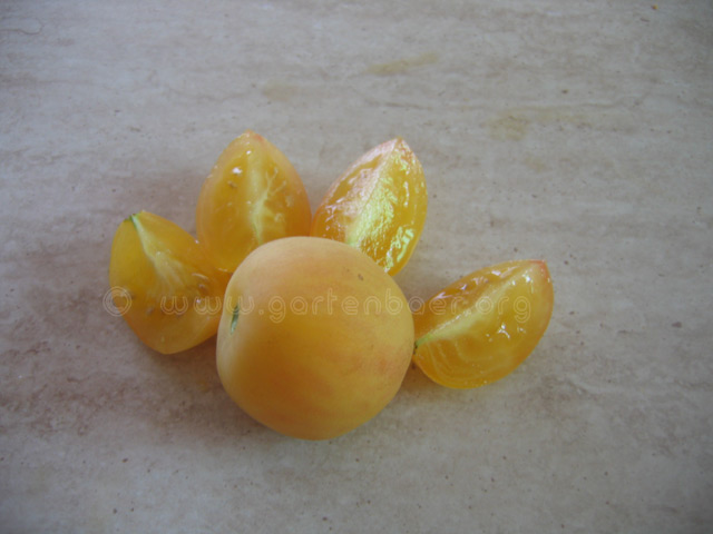 Gestern habe ich äußerst hübsche Tomate ernten können..."Ghost Cherry"Die ersten Samen sind leider nicht gekeimt, also hatte ich ca. einen Monat nach der eigentlichen Aussaat einfach mal noch ein paar Samen gesteckt. Es ist auch nur eine Pflanze dabei rausgekommen, aber die Tomaten sind recht hübsch finde ich.Sie ist etwas kleiner als ein Ping-Pong-Ball, hat eine leicht raue Schale, mit der sie wie kleine gelbe Minipfirsische aussehen. Der Geschmack ist süßlich, recht lecker, aber leider ist die Schale zu dick.Tomatige Grüße von den Gartenbären