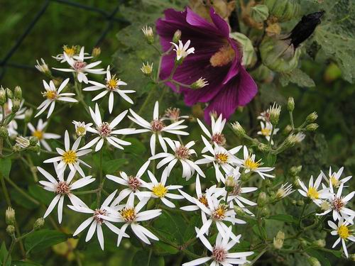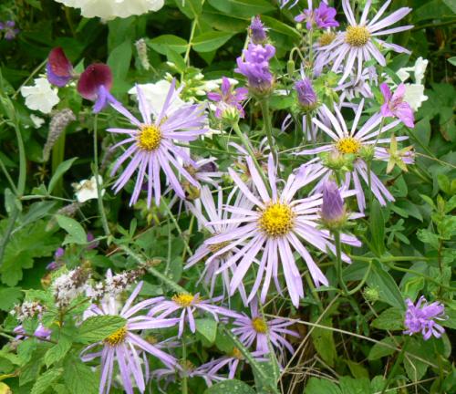 Ich könnte ja behaupten, auch meine Aster amellus sei in Not. Ist sie aber nicht. Sie breitet sich mit ihren hellen Schirmen freundlich über das Gewusel.