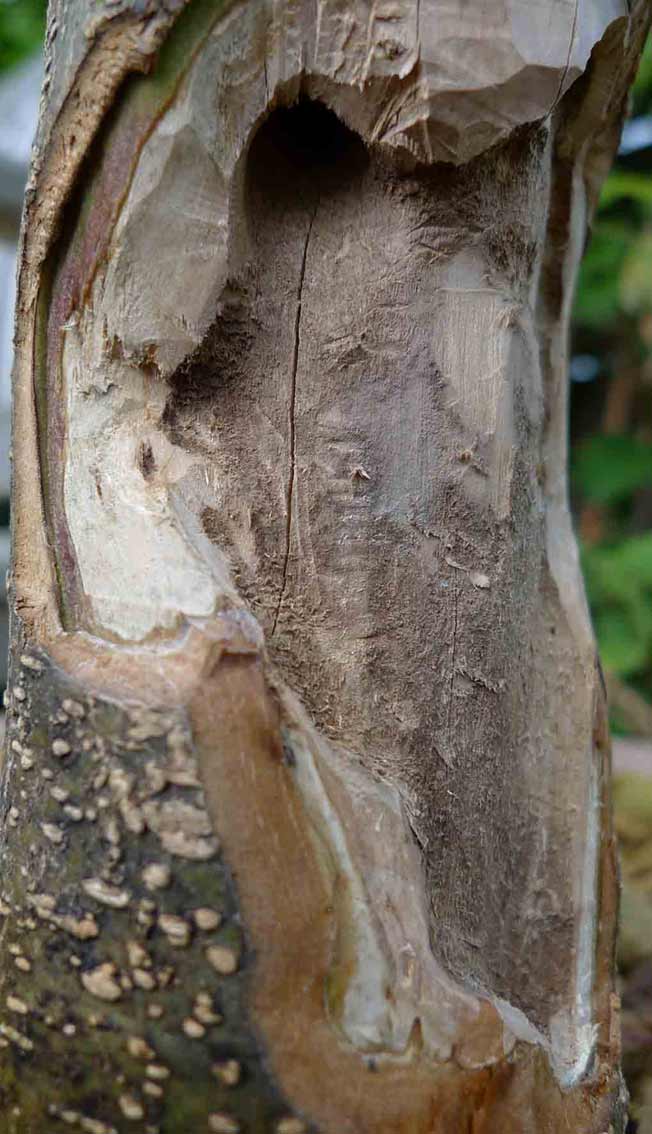 Bei großflächigen Stammbeschädigungen sind diese Risse normal. Das offenliegende Holz wurde von der Pflanze isoliert und verhält sich jetzt wie totes Holz. Es schrumpft beim trocknen.