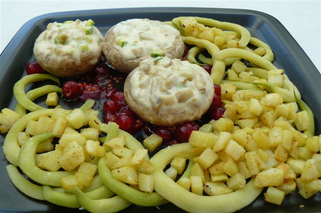Gefüllte Champignons auf pikanter Fruchtsauce, gelbes Posthörnchen, Brarkartoffeln