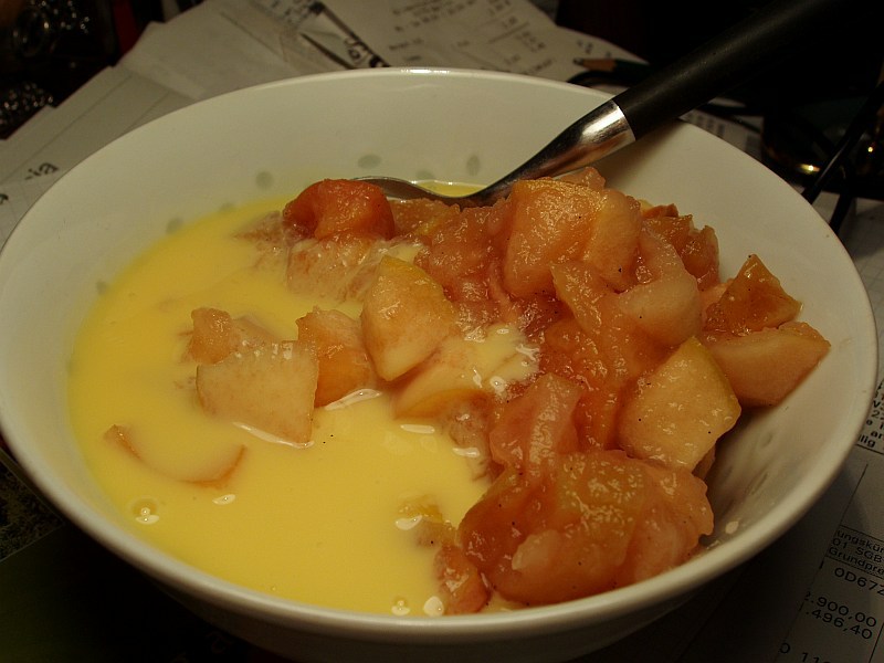 dann: lecker eintopf mit kohlrabi, kartoffeln, karotten und hackfleisch.und später, gerade eben zum abschluss:apfelkompott mit vanille und eierlikör!