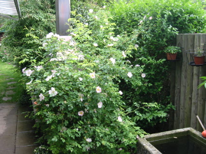 Die Canina habe ich bei unserem Einzug hier (Herbst 2003) als 20 cm grossen Sämling vorgefunden.Geblüht hat sie zum ersten Mal im Frühsommer 06 mit 3 Blüten