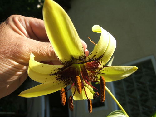 toll! ich würde auf lilium primulinum tippen. bei der poilanei soll sich die rotbraune färbung auf dem mittelstreifen der blütenblätter verlängern.