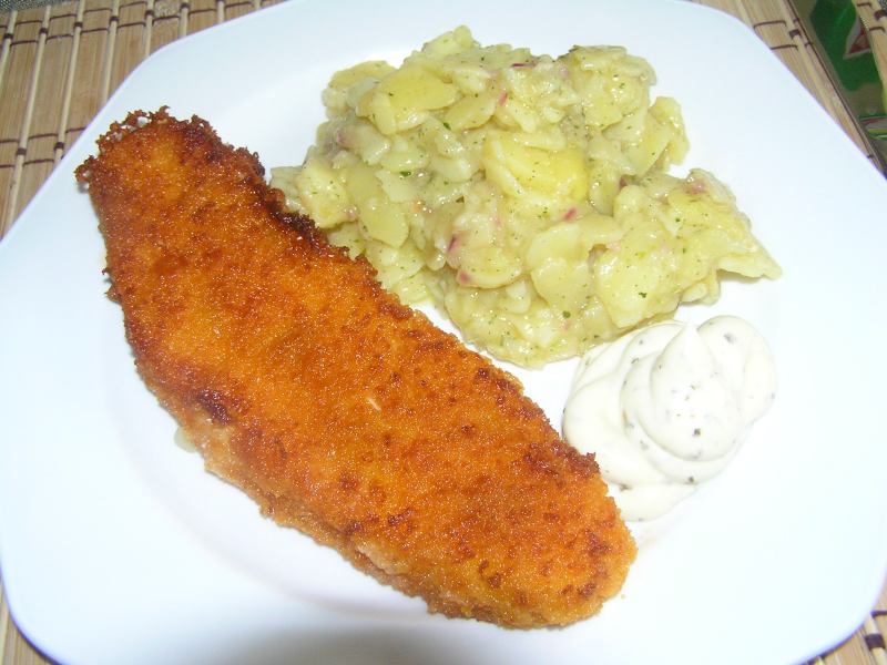 wir hatten gestern paniertes seelachsfilet mit schwäbischem kartoffelsalat und remoulade...
