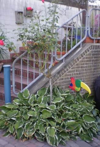 naja, so schnell wie freitagsfich würde ich den gedanken an eine rose für diese stelle nicht verwerfen. das bäumchen würde ich aber auch entfernen und mir eine gesündere Sorte aussuchen. ein trauerstamm in weiß (z.b. guirlande d´amour) könnte ich mir vorstellen zum blauen treppengeländer und zur Lichtkönigin Lucia; die herabhängenden relativ stachelarmen zweige könnten dann auch malerisch das formale treppengeländer umspielen bzw. überwachsen. oder wenn das zu breit wird dann lass doch an einem großen obelisken an dieser stelle die guirlande (o. a. weiße) und eine hellblaue clematis gemeinsam ranken. beides würde farblich passen ohne dass du lucia/lucifer