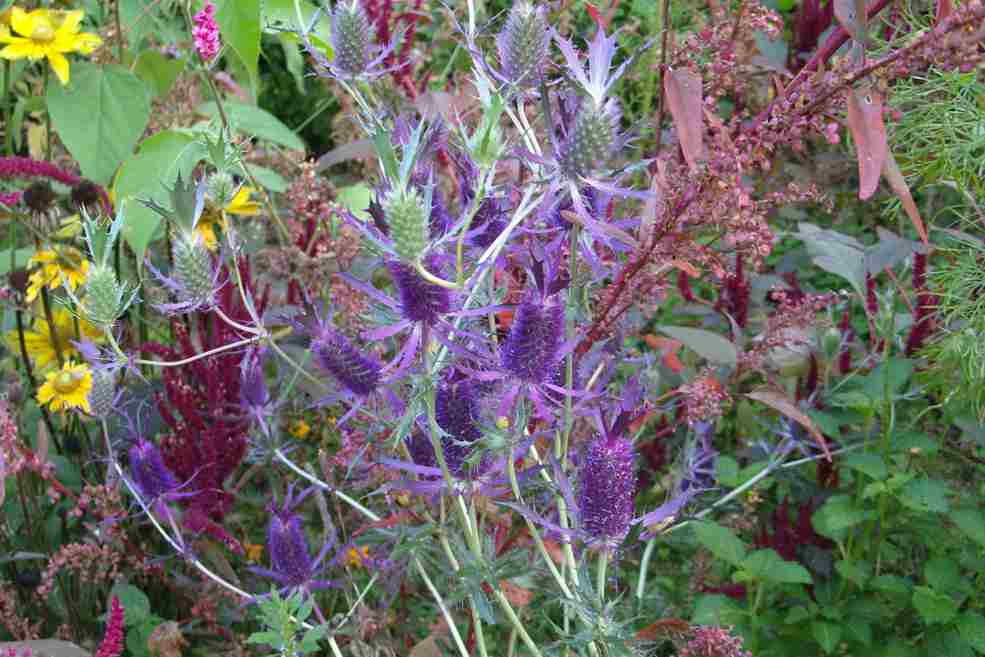 Vor allem, wenn die Melde dann noch hochrot dazwischendurch turnt.Die Farbe des Eryngium ist wirklich... lasziv.