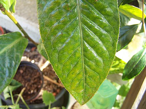 Jetzt das Blatt meiner unbekannten Kamellie, nur zum Vergleich wegen der gezähnten Blätter.