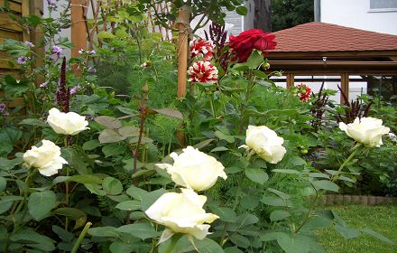 Valeria hat das sehr gut erklärt: Rosen mit bombastischen Blüten sind wirklich schwer zu kombinieren. Sie können ein relativ natürlich wirkendes Gesamtbild ganz schön zerditschen