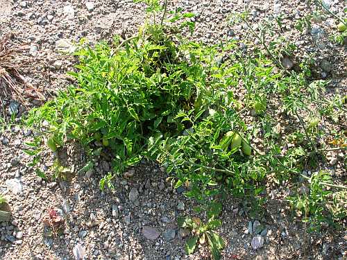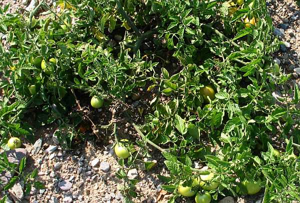 8)Habe heute wild aufgegangene Tomaten gesehen, die völlig gesund aussahen. Die wurden von niemand gepäppelt. Nicht vorgezogen, gedüngt, gegossen oder vor Regen geschützt. Es ist eine frisch aufgeschüttete Fläche (tippe auf letzten Herbst/Winter) kiesig. Hier mal die erste.