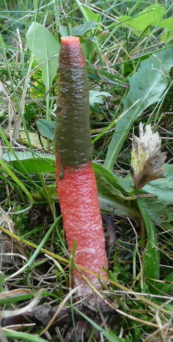 Mutinus caninus, die Hundsrute.Ist ein Verwandter der Stinkmorchel und ebenso wie die aufgrund des Geruchs vollkommen ungenießbar (außer in einem sehr sehr jungen Stadium, als so genanntes Hexenei).
