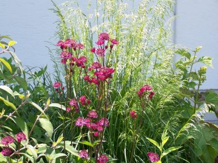 Sterndolden/Astrantia in Sorten!! Blühen den ganzen Sommer (und Herbst) und halten ewig in der Vase. Gedeihen bei mir auch im Nordbeet sehr gut.