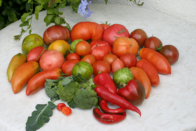 Herbstrettich, Stangenbohnen, bunter Mangold, Broccoli, Zucchini, Tomaten und Weintrauben