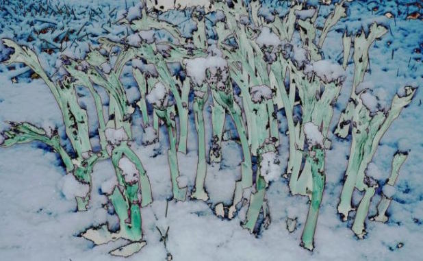 Vielleicht hat hier sonst noch wer Freude an verfremdeten Pflanzen? Das war mal Päonienaustrieb im Schnee:
