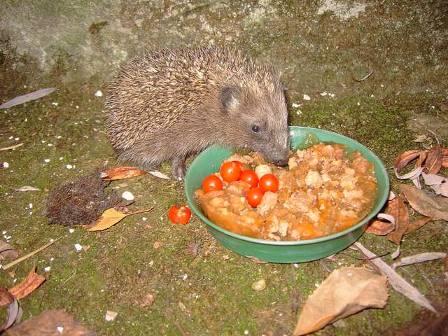 Endlich wieder Essen. Er schmatzt ganz laut.Der Winzling muß aber noch einiges zulegen vor dem Winter. Der Untersetzer hat nur 10 cm Durchmesser, das Igelkind ist auch nicht sehr viel größer.