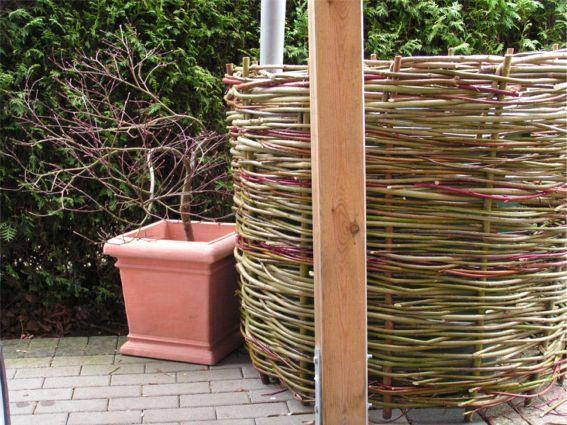 Ich belebe den Thread mal wieder :)Hier meine eigenen Flechtwerke. Z.B. meine Regentonne, deren Optik mich immer gestört hat, wenn ich auf unsere Auffahrt gefahren bin und im Carport einparkte. Dort mündet nämlich das Regenrohr in die besagte Tonne.