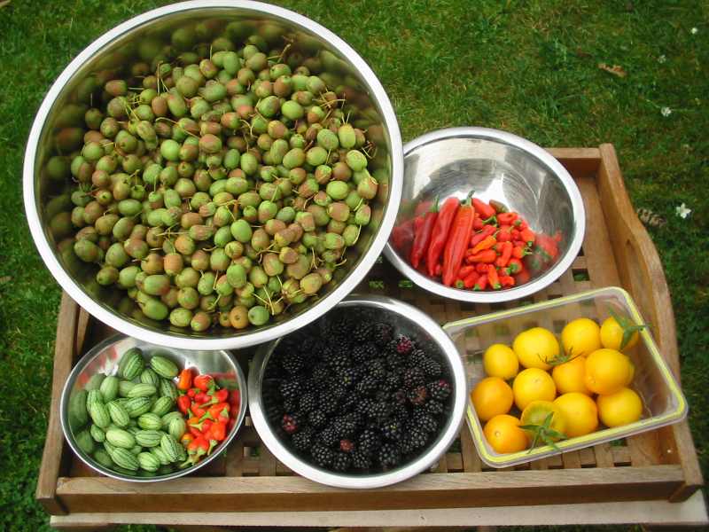 Eine handvoll Himbeeren, die letzten Bohnen, auch nur eine handvoll. Dann noch einzelne Birnen, Peperonis, Paprika, zwei Bund Dill, eine Schüssel Auberginen und ein halber Eimer voll Maronen