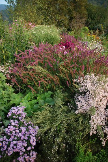 Eure Anmerkungen freuen mich und auch das Beet an sich. Es ist mein am deutlichsten durchkomponiertes Beet, trotzdem war die angesprochene Strukturfülle nicht geplant oder zumindest nicht in diesem Ausmaß: Amarant und Cosmeen haben sich nämlich eingesät und den herbstlichen Schwerpunkt an sich gerissen - eine spannende Entwicklung, aber eine Spur zu überladen... jetzt weiß ich es.Eigentlich sollten sich die Farbaspekte auf wenige Ausschnitte der Palette beschränken. Das hat bis Mitte Juli super geklappt, die Vorderseite war weiß, die hintere Seite mehr lila, danach sollte der Phlox und die Agastachen übernehmen und hin zur herbstlichen Violett und Purpurfülle führen, wobei der Anteil an Violett zunimmt. Daher ist das Cosmeenrosa etwas übertrieben, vor allem aber das viele hellgrüne Laub. Zudem sollten manche Pflanze Wolken und runde Kuppeln bilden - die Astern, Agastachen, Calaminthas und nur Gräser und feines Beiwerk (Gaura, Verbena, Sanguisorba) und aufragende Formen (Gräser, andere Agastachen, hohe Astern) sollten diese Formen durchbrechen... ist leider nicht ganz so deutlich ausgefallen, diese Idee