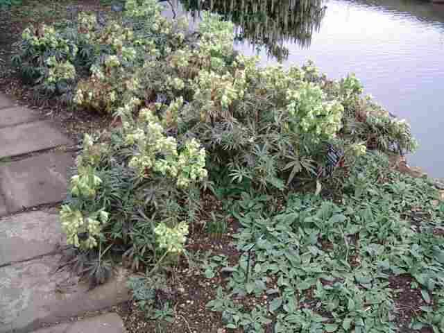 Günther, wenn jetzt auf dem Helleborus 3-Bild statt des H. foetidus lauter H. niger mit weißen Blüten stünden, wäre das farblich auffallender und von der Struktur der Bepflanzung her langweiliger, weil die H. niger so niedrig sind. Außerdem sind sie krankheitsanfälliger.Spiegelt sich da übrigens im Wasser eine Garrya elliptica? Auch so ein Strauch, der in England besser gedeiht als bei uns.