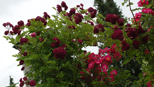 (wir brauchen hier ein Smilie, der auf dem Boden liegt und sich vor Lachen den Bauch hält).Aber ne, im ernst: Irgendwann rücke ich diesem Beton zu Leibe. Nur nicht schon jetzt für die Rose. Nachdem wir, d.h. mehr mein Freund gehämmert und gekloppt hat, er dann die Stelle wieder zugemacht hat, werde ich ihn nie und nimmer dazu bewegen können, wieder dranzugehen. Aber: Unser Hofbelag ist eh total hinüber; früher oder später wollen wir Kopfsteinpflaster für den Hof. Das heißt, dieser Betonboden wird dann eh heruntergenommen. Dann lassen wir vor den Wänden Platz frei für Pflanzen.Ihr seid super! Es sind jetzt so viele Einschätzungen und Ideen zusammengekommen. Die Idee mit der Regentonne, backus, ist super. Ich wollte zwar kein Plastik, aber wenn ich sehe, um wieviel günstiger das ist und wieviel Erde die Pflanze bekäme ... Alles in allem habe ich Folgendes verstanden: Es könnte alles funktionieren - Kübelhaltung, volle Sonne, Halbschatten. Besser wäre natürlich Erdreich für die schöne Rose, klar. Lehm ist also auch kein Problem. marcir, oben angekommen hätte die Rose sehr viel Sonne. Aber wird sie wirklich jemals oben ankommen? Ich habe schon so viel probiert an der Stelle - immer nur kümmerlicher Wuchs. Ich habe jetzt ein Foto gemacht von der Wand - die will ich seit 8 Jahren, seit dem Kauf des Hauses, zuwachsen lassen. Eine wilde und eine andere Clematis, Akebie, Rose und noch etwas, weiß nicht mehr. Nichts hat geklappt. Die nichtwilde Clematis steht noch dort - ihr seht auf dem Foto, wie sie mickrig ist und gerade mal den Anfang des Gitters erreicht hat - während hier im Ort Clematis üppig an Hauswänden hängt. Deshalb kam ich zu dem Schluss - ne, das ist hier zu dunkel für diese Pflanzen, hier kommt etwas hin, das auch Schatten gut verträgt. Ich wollte jetzt für diese Stelle ein Immergrünes und ein sommergrünes Geißblatt probieren.Und was mache ich mit der Bleu Magenta? Ich habe euch so lange nicht geantwortet, weil ich euch jetzt eine Entscheidung mitteilen wollte. Aber ich bin immer noch nicht entschieden. Muss wohl eure Erfahrungen sacken lassen. Zwischendrin habe ich sogar überlegt, ob ich nicht ein paar andere Pflanzen im Garten opfere und die Bleu Magenta doch noch in den Garten setze - an einem Rosenbogen. Nachteil: Ringsherum wären Pflanzen, die garantiert jedes Jahr Läuse bekommen - ich habe mich dumm und dämlich gespritzt mit Wasser-Spüli-Öl-Mischung, hat auch geholfen. Nur wenn die Blue Magenta hinzukommt, die angesteckt würde, dem würde ich nicht mehr Herr werden. Ich denke, ich verzettel mich jetzt nicht und bleibe bei den beiden möglichen Varianten - Kübel/Terrasse oder Kübel/Hof.Habt lieben Dank, dass Ihr so schöne Fotos eingestellt habt! Das sieht so schön aus! Ist ja echt eine wunderbare Rose. So ein Mist, sie sollte wirklich tief wurzeln können. Ob ich sie einfach jemandem verschenke, der auch Platz dafür hat?Lieben Gruß und nochmals tausend Dank - was nicht heißt, dass ich die Diskussion darüber abschließen möchte. Ich lese sehr gern weiter dazu.Can