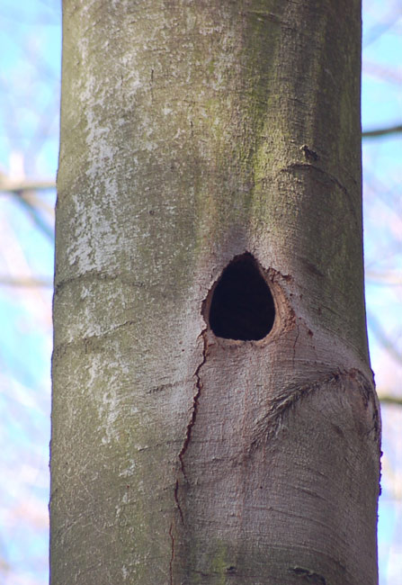 Am Rande des Spessarts, 200 Meter oberhalb des Mains, befinden sich Wiesen, zwischen denen nur ein Radweg lang läuft. Auf dem Hügel liegt ein kleiner Mischwald mit altem Baumbestand. Wenn man sich leise verhält, sieht man Buntspechte, den Schwarzspecht, Kleiber, Gartenbaumläufer, Grünspecht, Finken und Meisen und an den Waldrändern kreisen Greifvögel. Den Schwarzspecht hoffe ich noch fotografieren zu können: Seine Behausung etwas weiter unterhalb des Hügels habe ich durch einen Zufall gefunden (Nebenrollen in diesem Zufall spielen ruinierte Lederstiefel, ein verzweifelter Handyanruf, der Wunsch nach einem Getränk und die Verwünschung von mit Strom eingezäunten Wegen)Der Schwarzspecht ist der größte europäische Specht und bevorzugt für seine Höhle sehr alte Bäume, die mindestens 4 Meter hoch astfrei sind.