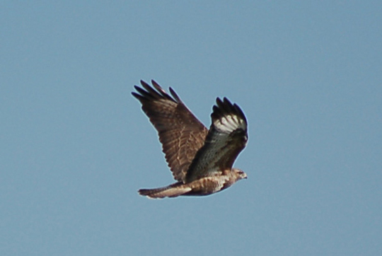 Sobald man in die Nähe des Waldes kommt, hört man sie schreien, die Greifvögel. Ich zweckentfremde dann auch gerne mal des Jägers Hochsitz, mit dem ich nur die Wartehaltung und das Abdrücken (mit meiner Kamera) im richtigen Moment gemein habe. Neulich sah ich einen fast weißen Mäusebussard und dachte noch, das kann nicht sein. In meinem Vogelführer habe ich jetzt aber nachgelesen, dass es den tatsächlich gibt. Auch hier kein schönes Foto, aber man kann was erkennen