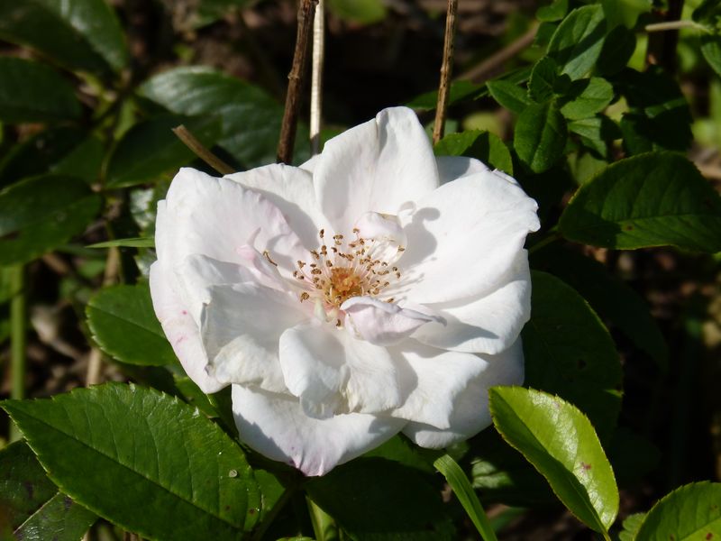 Rosengemisch: Stanwell perpetual blüht noch, R. glauca daneben hängt schon voller Butten