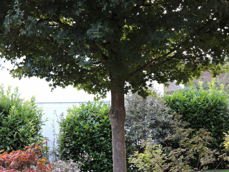 Das "Bäumchen" deckt die Fenster des Nachbarhauses im Sommer ganz ab, vom kleinen Sitzplatz aus geschaut, da kommen keine Blicke durch. (Und eigentlich war der Baum als Schattenbringer für den andern Sitzplatz geplant, der Sichtschutz war Zugabe.) Der Baum muss alle zwei, drei Jahre beschnitten werden, steht recht nah am Haus, darum darf er nicht ein ganz Grosser werden. Aber seit er da ist hat der Garten sein Dach.