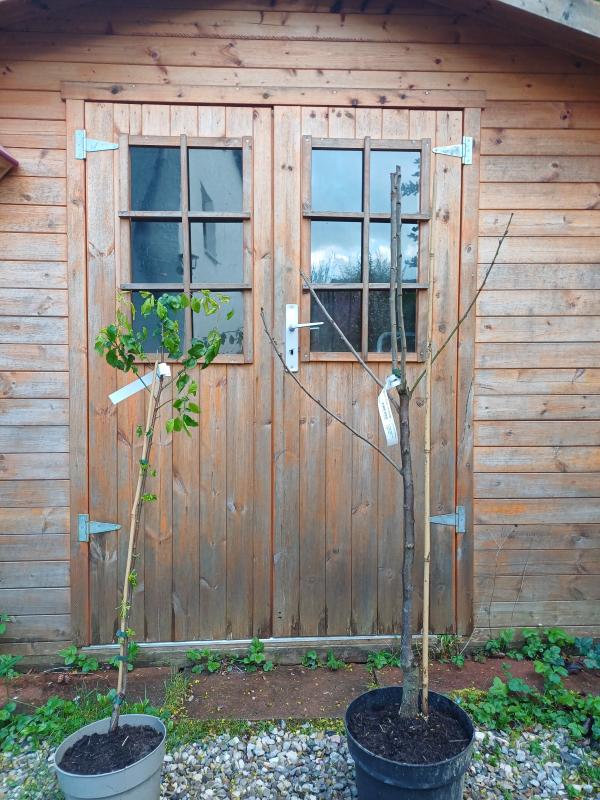 Was ich von meinen beiden Neuankömmlingen vom Pflanzenhof halten soll, weiß ich noch nicht so genau. Aprimira und Aprikyra, beides Buschbäume mit eher schwach wachsender Unterlage. Beide schauen eigentlich gut aus, dafür daß das Paket wohl nicht sehr pfleglich behandelt wurde. Allerdings kamen sie ohne Topf, stattdessen im Plastiksackerl, was beim zarteren der beiden zu quasi wurzelnackt geführt hat.