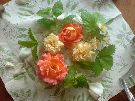 am we habe ich einmal bei meinen eltern gewildert und ein paar rosenblüten zur tischdeko benutzt ;)es sind blüten der buff beauty (zartcreme) mit westerland und einem zweiglein der zum ersten mal blühenden lykkefund...dazu blätter von zitroenmelisse, walderdbeeren und apfelminze: ein zart blumig-frischer duft entströmte der schale den ganzen tag