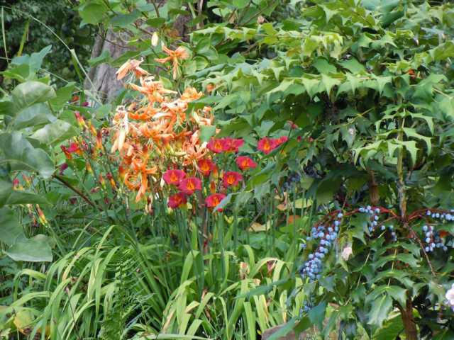 Einfach mal losfotografiert heute...Schattenhang, Hemerocallis "Little Joy", Lilium henryi und Früchte der Mahonia"Wintersun"