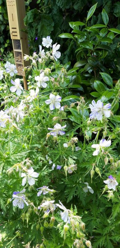 Für Geranium pratense kleine, zart gefüllte Blüten hat 'Summer Skies'. Nach einem Jahr Einwachsen will er in diesem Jahr offenbar reich blühen.