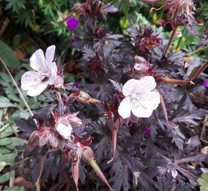 2 Jahre verschwunden, plötzlich wieder da. Entweder "Purple Ghost" oder "Black'nWhite"? Was kann das sein? Ist nur sehr klein, gerade mal 20 cm hoch, allerdings war sie auch unter einem anderen Geranium versteckt.