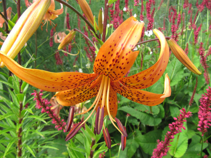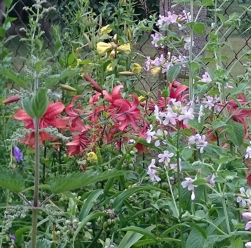 Und eine niedrige, ziegelrote mit relativ wenig Blüten, aber die Bulbillenschmeißerin schlechthin.Das gestalterisch unsägliche Durcheinander bitte ich zu entschuldigen, ein Eingreifen ginge derzeit nicht ohne Flurschäden ab.