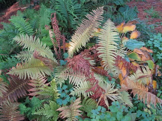 Dass Farne gerade im Herbst noch so schön sind, vergesse ich immer wieder. Sehr frischgrün: Dryopteris erythrosora.