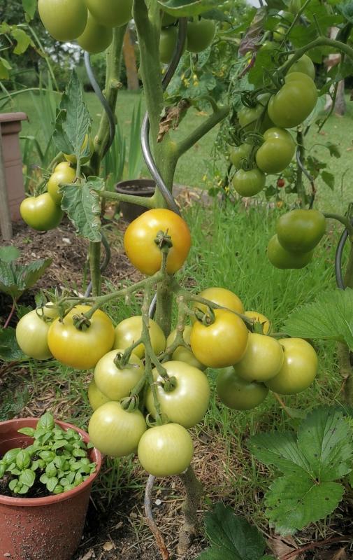 Nochmal zu den Braunfäule-Widerstandsfähigen. Im Anbau habe ich die schon seit ein paar Jahren (geplant ist, damit in einem Aussengarten extensiv ohne viel Pflege Tomaten für die Verarbeitung anzubauen), aber kaum ein Jahr ist besser geeignet, um die zu testen. "Honeymoon" und andere habe ich ja schon genannt, hier Cocktail-Crush, die ersten Roten sind schon abgeerntet: