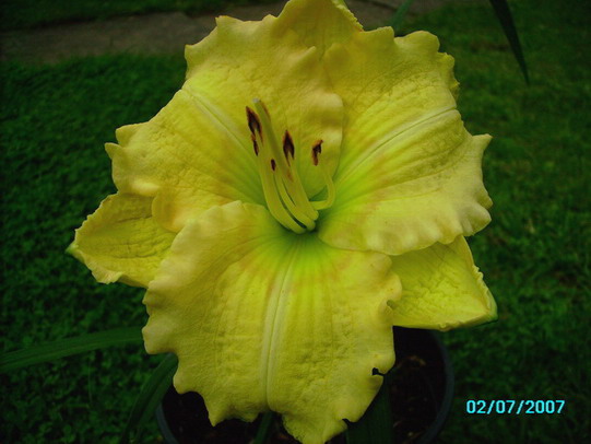 Pinching kann ich an den Petalen nicht entdecken auf dem Foto, da müssten sie entlang der Mittelrippe richtig gefaltet sein so wie bei 'Red Suspenders'.Aber eine schöne Farbe. Weißt du denn den Namen nicht, rosetom?Und eine mit einem sagenhaft grünen Auge und gepinchten (heißt das so?) Petalen:
