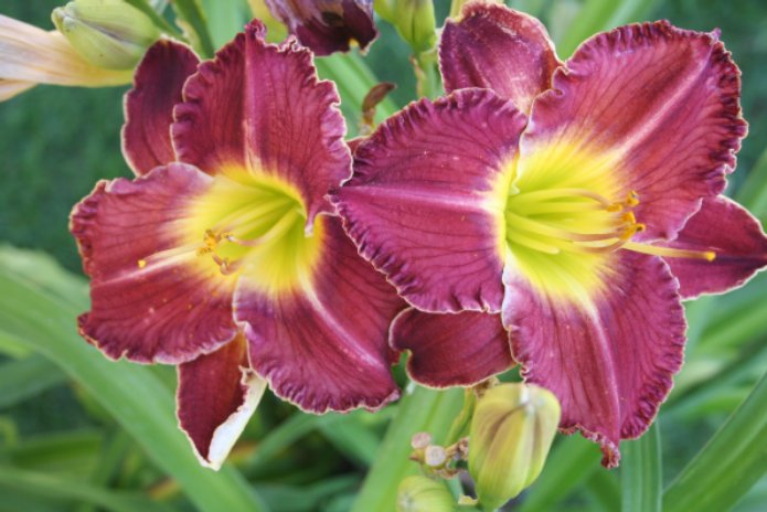 Der Jammer ist nur, dass dieser Züchter nicht Buch führt über seine Kreuzungen und man deshalb nicht weiß, ob dip oder tet ...Er meinte, die meisten seiner Taglilien wären diploid, aber gefühlsmäßig denke ich, dass eine so starke Rüschung mit Goldrand wie bei der Roten wohl eher bei Tetraploiden anzutreffen sein müsste; dafür würden auch sehr kräftigen Stängel und die eher großen Staubgefäße sprechen, oder täusche ich mich?