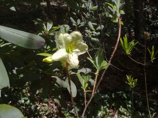 Rhodoendron ambiguum blüht hellgelb, die Blüte fällt im frischen Austrieb kaum auf.