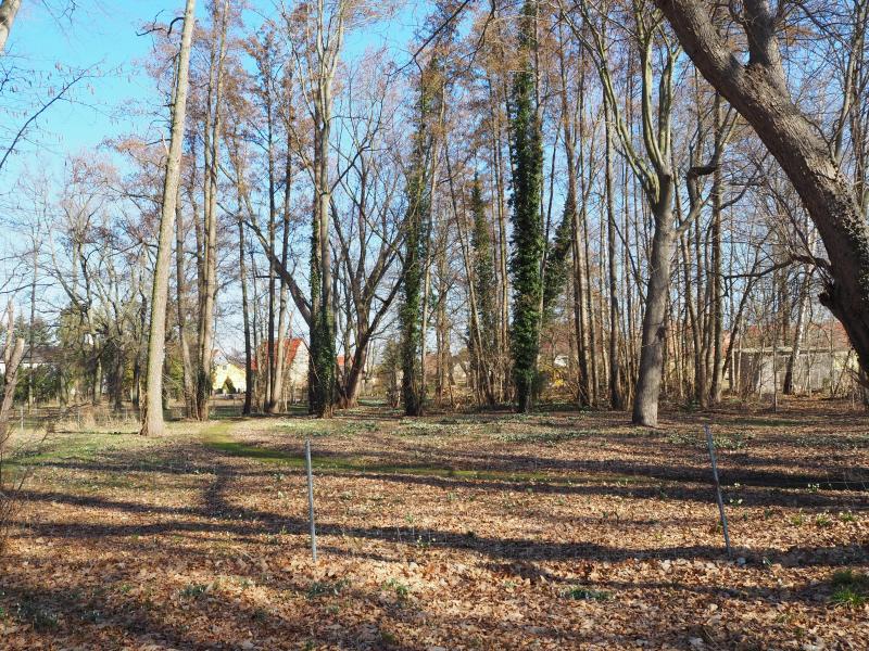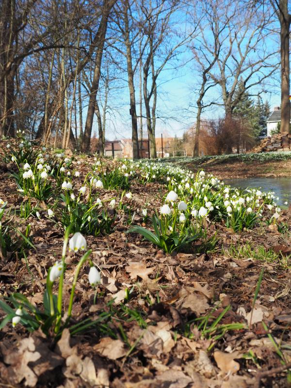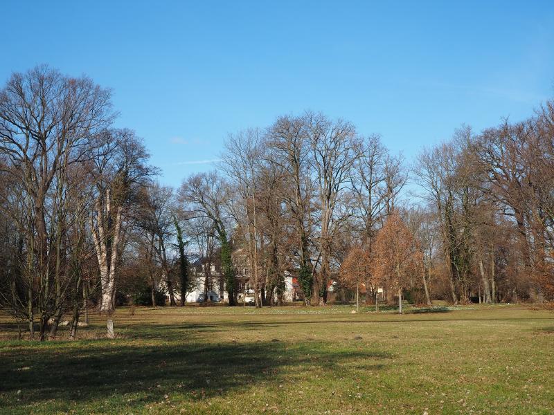 Blick von der Wiese am Weg, der zu den bunten Bänken führt, zurück zu Park. Wenn man genau hinschaut, sieht man ganz leicht die weißen "Glöckchenschleier" auf der Wiese