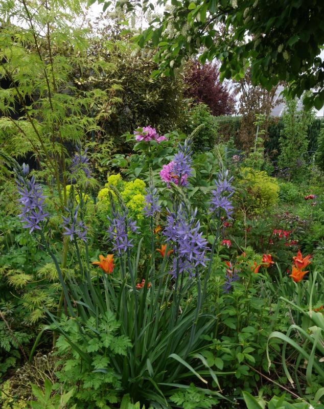 Prunus virginiana 'Shubert' mit Camassia, Tulpe 'Ballerina', Dicentra 'Valentine', Strauchpaeonie u.a.